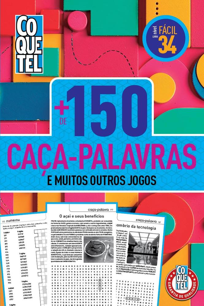 Mais de 150 caça-palavras e diversos jogos para turbinar sua mente com diversão! Mais de 150 caça-palavras Nível fácil e ideal para todas as idades Inclui outros passatempos como Numerox e desafios com textos Perfeito para relaxar e manter o cérebro ativo O Livro Coquetel +150 Caça-Palavras é a pedida certa para quem busca um passatempo leve, educativo e envolvente. São mais de 150 diagramas com temas variados - como saúde, bem-estar, ciência, tecnologia, cultura e alimentação - que estimulam o vocabulário e a concentração. Além disso, o livro traz outros jogos como Numerox e desafios com textos ilustrativos, ampliando a experiência e o aprendizado enquanto se diverte. Com linguagem acessível, visual organizado e o selo de qualidade da Coquetel, esta edição é ideal para leitores iniciantes ou para quem quer relaxar longe das telas. Uma ótima opção para levar na bolsa, presentear ou criar momentos de pausa produtivos no dia a dia. Caça-palavras Coquetel: diversão, conhecimento e foco em uma só atividade!
